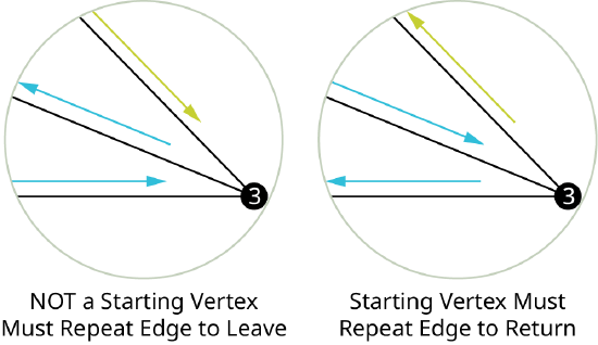 This is consistent with what we learned about vertices off odd degree when we were studying Euler circuits. We saw that a vertex of odd degree couldn't exist in an Euler circuit as depicted in Figure \(\PageIndex{3}\). If it was a starting vertex, at some point we would leave the vertex and not be able to return without repeating an edge. If it was not a starting vertex, at some point we would return and not be able to leave without repeating an edge. Since the starting and ending vertices in an Euler trail are not the same, the start is a vertex we want to leave without returning, and the end is a vertex we want to return to and never leave. Those two vertices must have odd degree, but the others cannot.