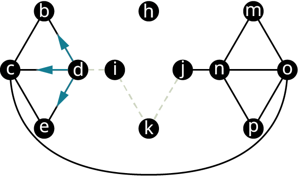 In sociology, bridges are a key part of social network analysis. Sociologists study two kinds of bridges: local bridges and regular bridges. Regular bridges are defined the same in sociology as in graph theory, but they are unusual when studying a large social network because it is very unlikely a group of individuals in a large social network has only one link to the rest of the network. On the other hand, a local bridge occurs much more frequently. A local bridge is a friendship between two individuals who have no other friends in common. If they lose touch, there is no single individual who can pass information between them. In graph theory, a local bridge is an edge between two vertices, which, when removed, increases the length of the shortest path between its vertices to more than two edges. In Figure 12.158, a local bridge between vertices b and e has been removed. As a result, the shortest path between b and e is b → i → j → k → e, which is four edges. On the other hand, if edge ab were removed, then there are still paths between a and b that cover only two edges, like a → i → b.