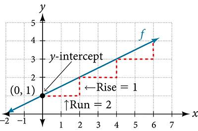 The slope is Because the slope is positive, we know the graph will slant upward from left to right. The y-intercept is the point on the graph when The graph crosses the y-axis at Now we know the slope and the y-intercept. We can begin graphing by plotting the point We know that the slope is rise over run, From our example, we have which means that the rise is 1 and the run is 2. So starting from our y-intercept we can rise 1 and then run 2, or run 2 and then rise 1. We repeat until we have a few points, and then we draw a line through the points as shown in Figure 2.
