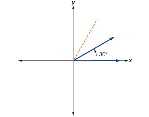 Angle creation is a dynamic process. We start with two rays lying on top of one another. We leave one fixed in place, and rotate the other. The fixed ray is the initial side, and the rotated ray is the terminal side. In order to identify the different sides, we indicate the rotation with a small arc and arrow close to the vertex as in Figure 4.