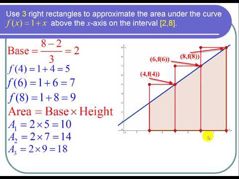 the process of dividing the interval into equal parts, extending a rectangle to the graph of the function, calculating the areas of the series of rectangles, and then summing the areas yields an approximation of the area of that region. - When using a regular partition, the width of each rectangle is