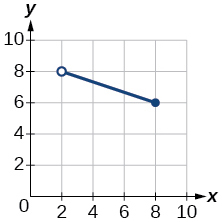 Each of the component functions is from our library of toolkit functions, so we know their shapes. We can imagine graphing each function and then limiting the graph to the indicated domain. At the endpoints of the domain, we draw open circles to indicate where the endpoint is not included because of a less-than or greater-than inequality; we draw a closed circle where the endpoint is included because of a less-than-or-equal-to or greater-than-or-equal-to inequality.