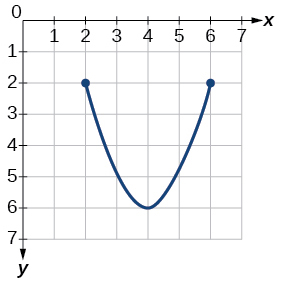 We can observe that the graph extends horizontally from to the right without bound, so the domain is The vertical extent of the graph is all range values and below, so the range is Note that the domain and range are always written from smaller to larger values, or from left to right for domain, and from the bottom of the graph to the top of the graph for range.