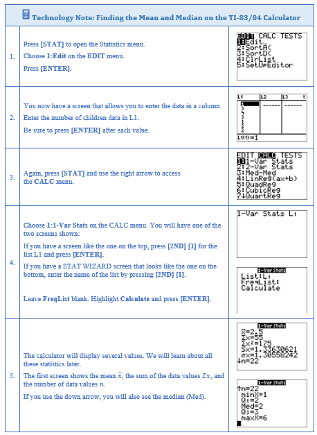 For larger data sets, technology will be useful. The procedure for finding the mean and median using a TI calculator is shown.