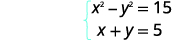 equations.First sentence. The difference of the squares of two numbers is 15. Second sentence. The sum of the numbers is 5. Solve the system by substitution Solve the second equation for x. Substitute x into the first equation. Expand and simplify. Solve for y. Substitute back into the second equation. The numbers are 1 and 4.